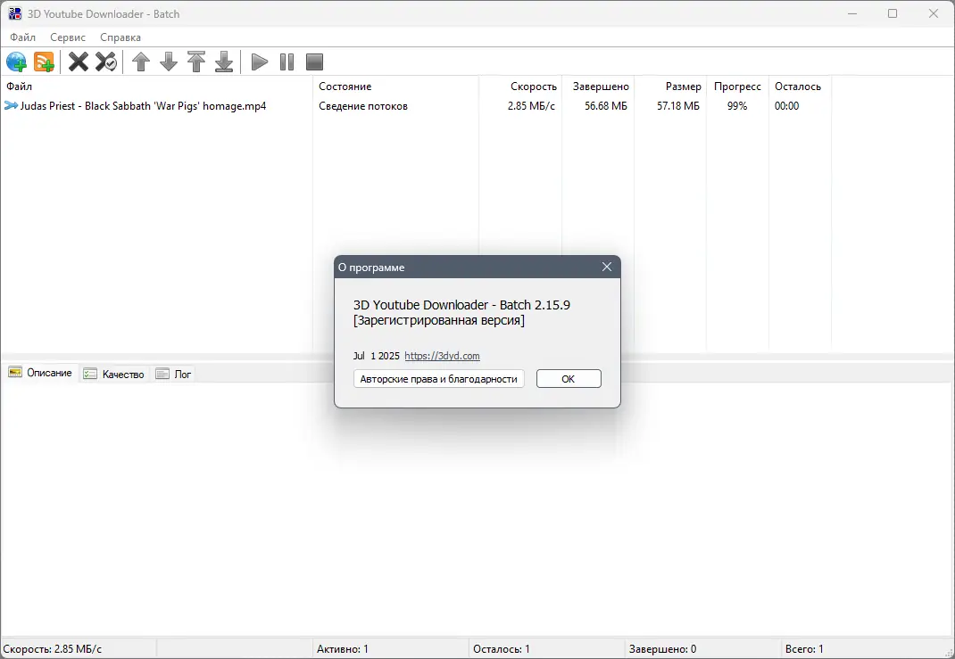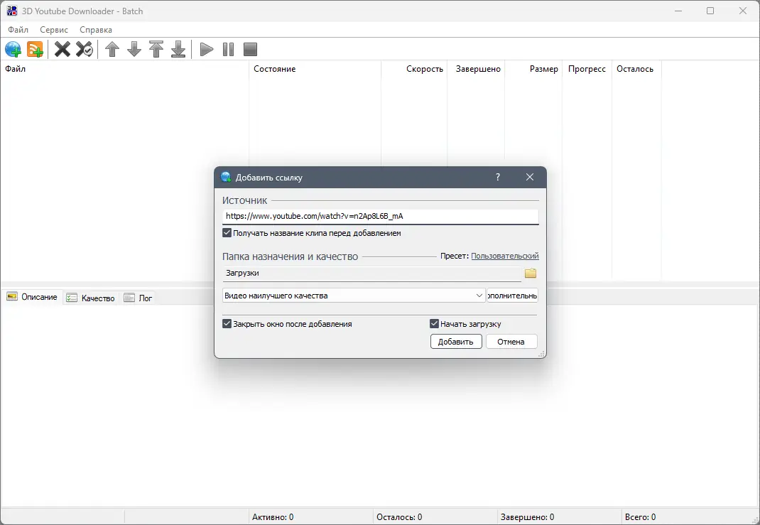 3D Youtube Downloader Batch — мощное приложение для быстрой пакетной загрузки видео с YouTube и других популярных платформ. Программа поддерживает скачивание целых плейлистов, каналов и отдельных роликов, автоматически распознаёт доступные форматы и качества. Благодаря встроенному мониторингу буфера обмена и поддержке множественных URL, процесс добавления задач становится максимально простым и эффективным.
