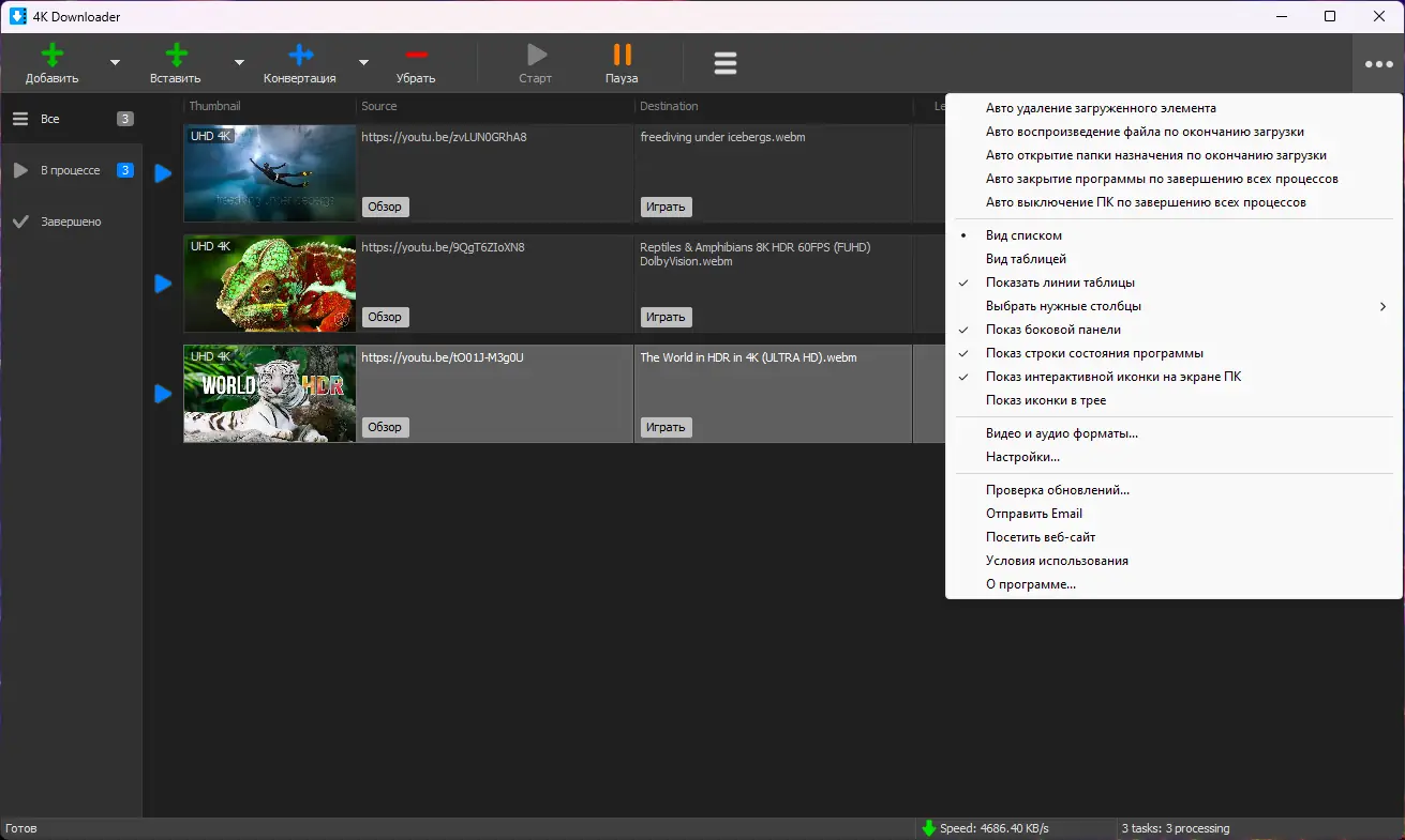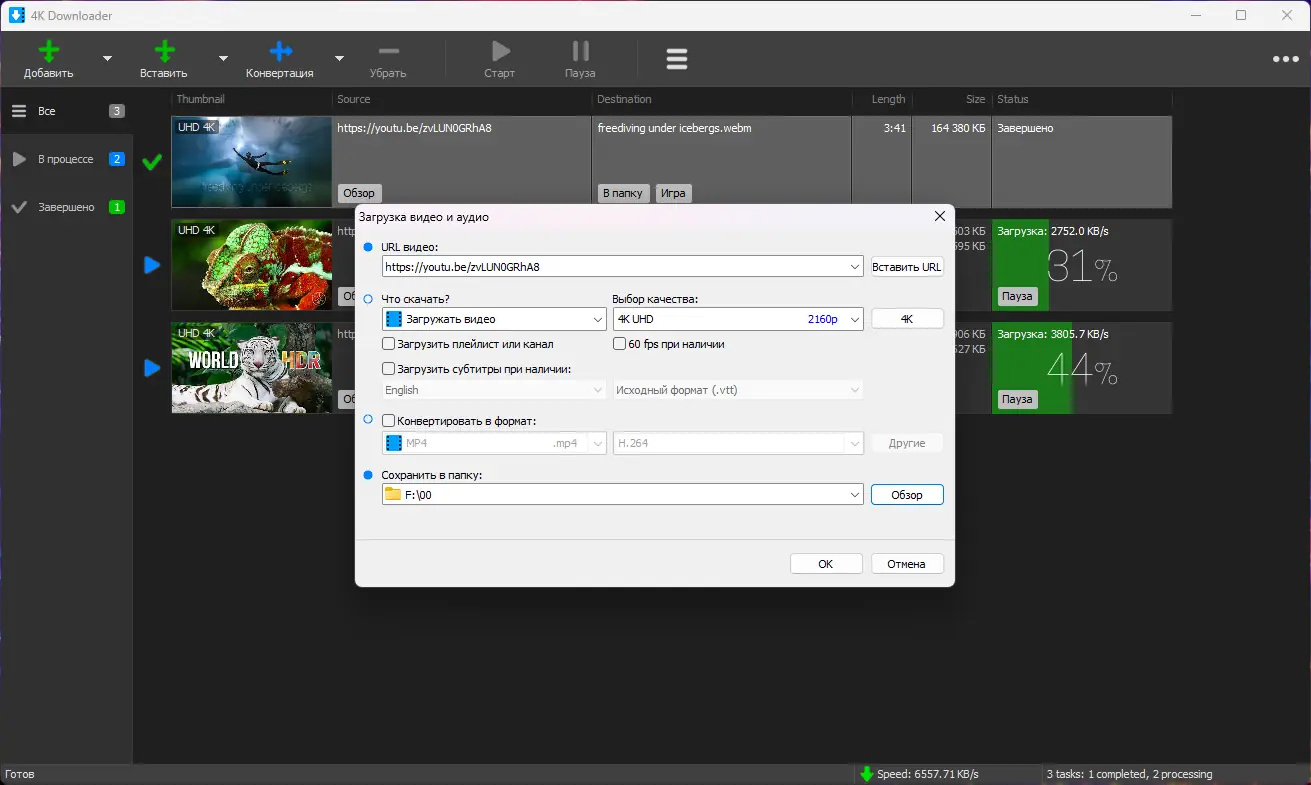 4K Downloader — это мощное приложение для загрузки видео с популярных платформ, включая YouTube, Dailymotion и другие, в высоком и сверхвысоком качестве, вплоть до 8K UHD. Программа поддерживает скачивание отдельных роликов, плейлистов и целых каналов, обеспечивая простоту использования и высокую скорость обработки. Благодаря интуитивному интерфейсу и автоматическому распознаванию скопированных ссылок, пользователь может быстро начать загрузку без лишних действий.
