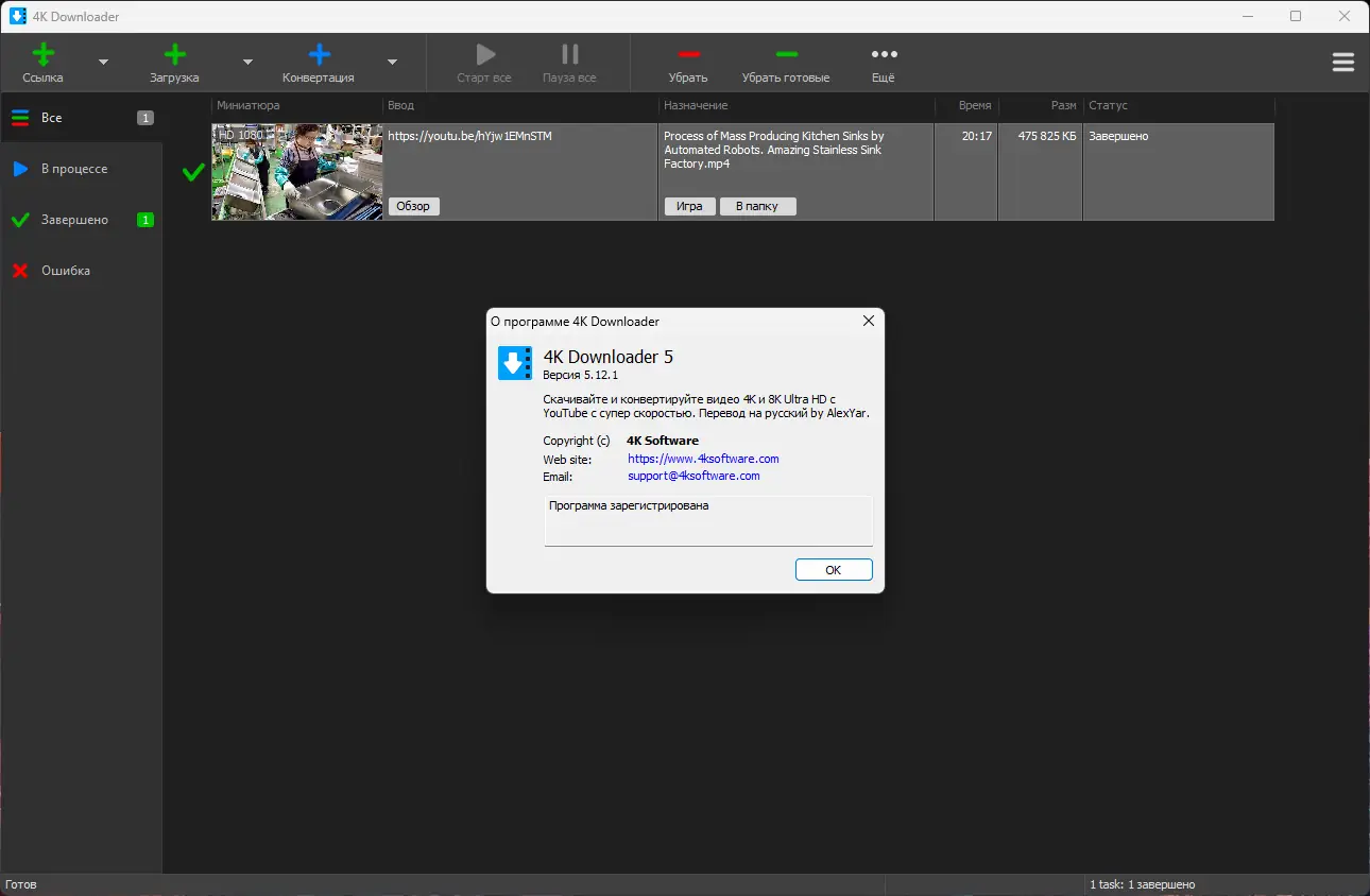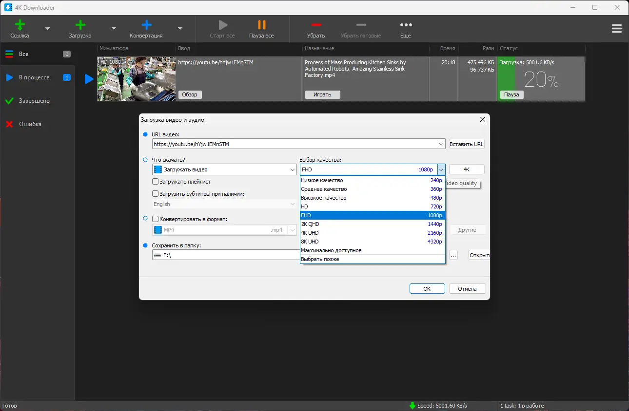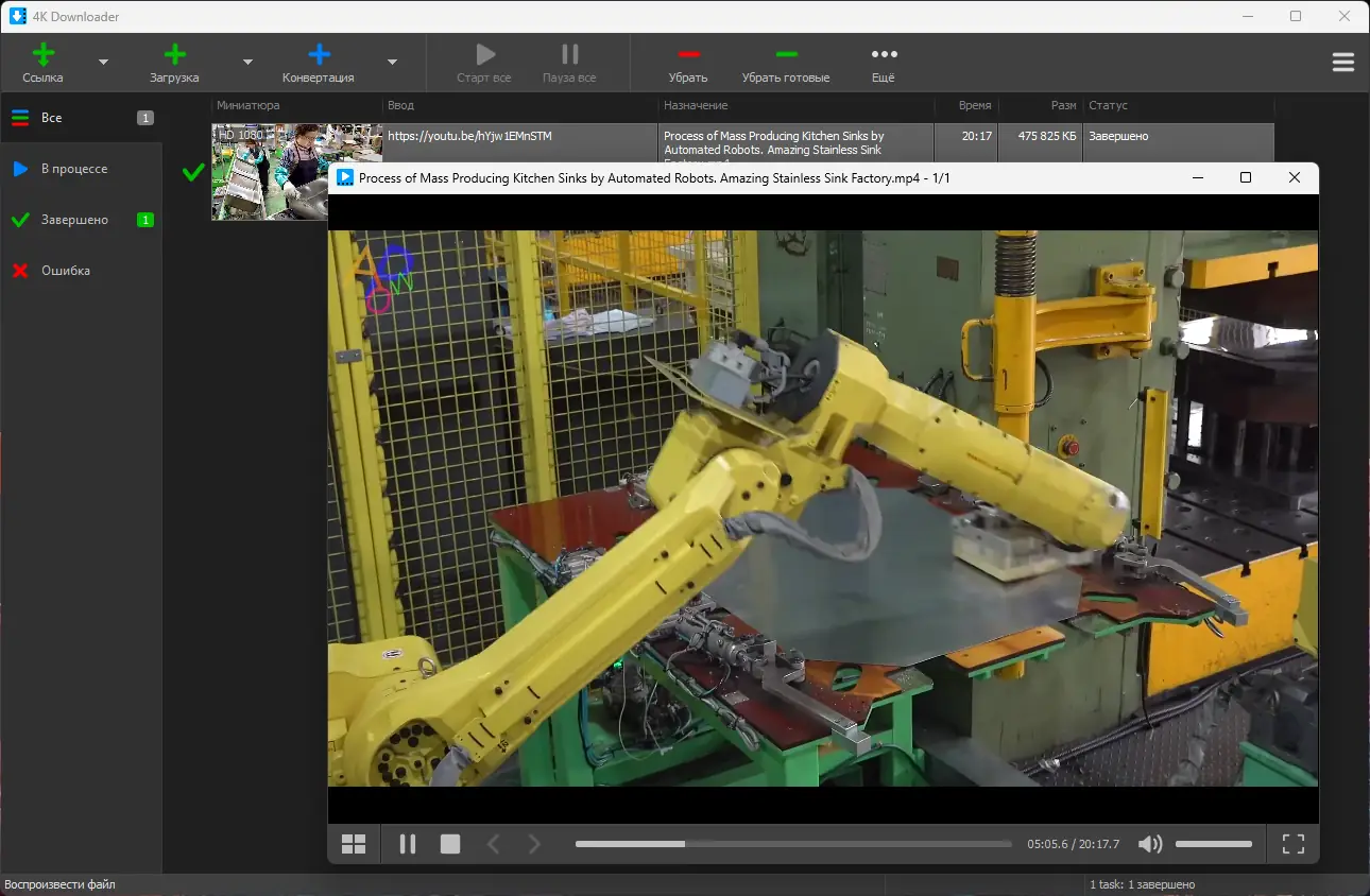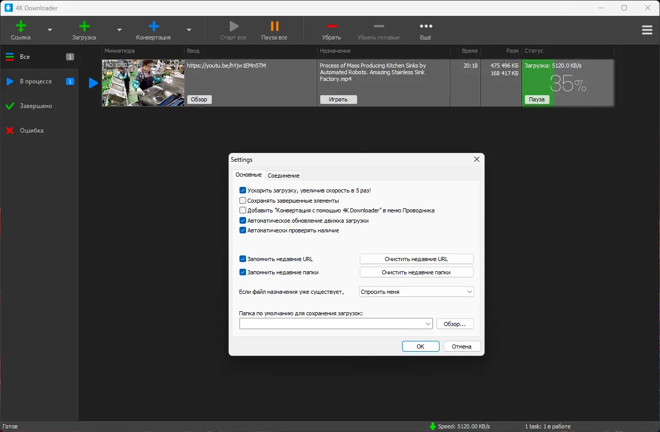 Использование приложения начинается с копирования ссылки на нужное видео или плейлист. После этого 4K Downloader автоматически подхватывает URL и предлагает выбрать формат и качество загрузки. Пользователь может выбрать, сохранять ли полное видео, только аудиодорожку или конвертировать файл в другой формат позже. Программа поддерживает очередь загрузок, что позволяет добавлять несколько файлов и оставлять их для обработки в фоновом режиме. Также доступна возможность указать папку назначения, включая сетевые диски и подключённые устройства. После завершения процесса файлы можно просматривать через встроенный проигрыватель или переносить на любое совместимое устройство.