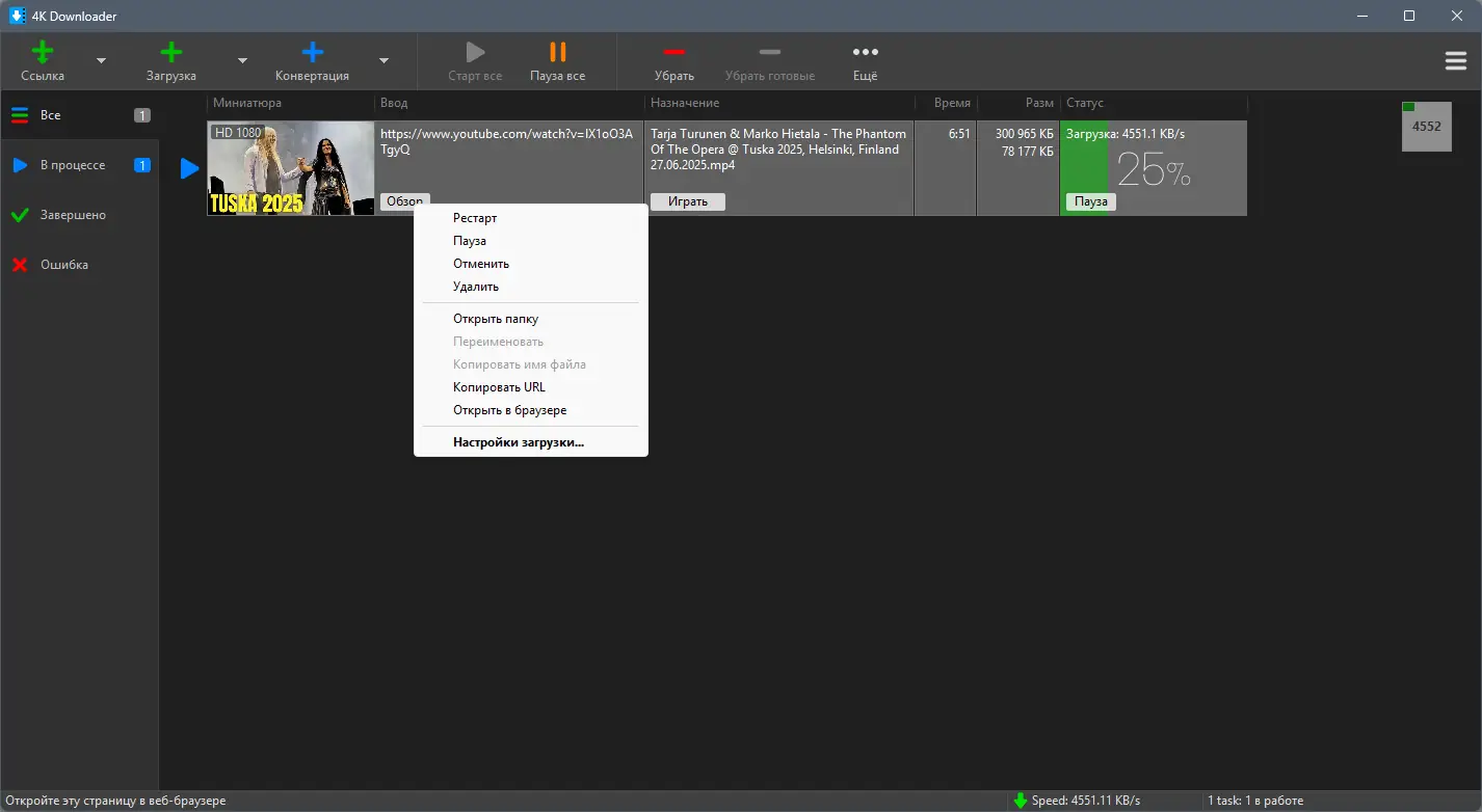 4K Downloader сочетает в себе производительность, надёжность и гибкость в работе с онлайн-видео. Он поддерживает широкий диапазон сервисов и форматов, что редко встречается в бесплатных решениях. Программа легко справляется с большими объёмами данных и не перегружает систему. В то же время, некоторые функции могут быть ограничены в зависимости от версии установки. Тем не менее, общее впечатление остаётся положительным благодаря продуманному подходу к пользовательскому опыту.