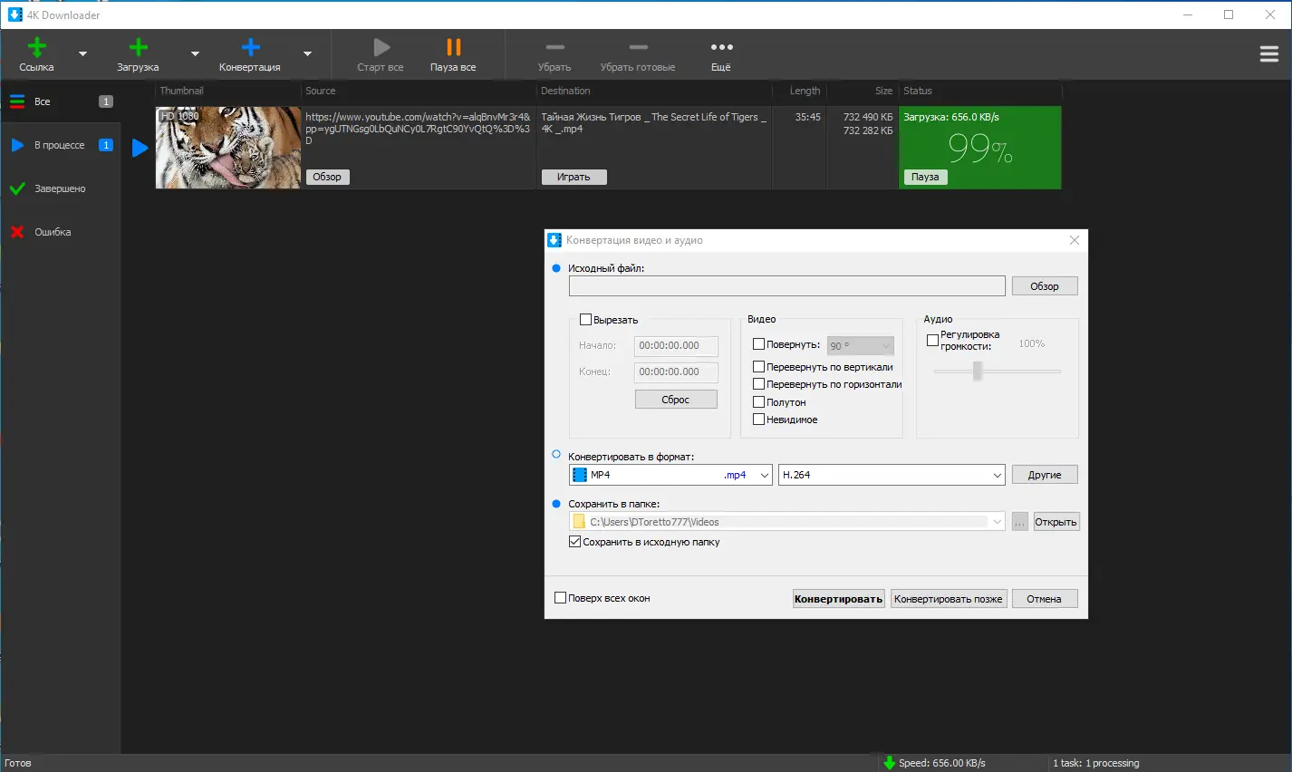 Пользоваться 4K Downloader предельно просто: нужно лишь скопировать ссылку на нужное видео или плейлист, после чего приложение само обнаружит её и предложит варианты загрузки. Пользователь может выбрать желаемое разрешение, формат файла, а также указать, требуется ли только звук в формате MP3 или полное видео. Для организованной работы доступна функция добавления задач в очередь, что особенно удобно при массовом скачивании. Также можно настроить папку назначения, включая сетевые диски и подключённые устройства. Конвертация выполняется отдельно, что позволяет обрабатывать уже сохранённые файлы по мере необходимости, не перегружая процесс загрузки.