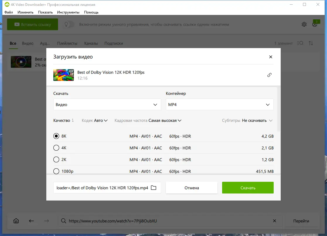 - Скачивание видео в разрешении до 8K с поддержкой HDR
