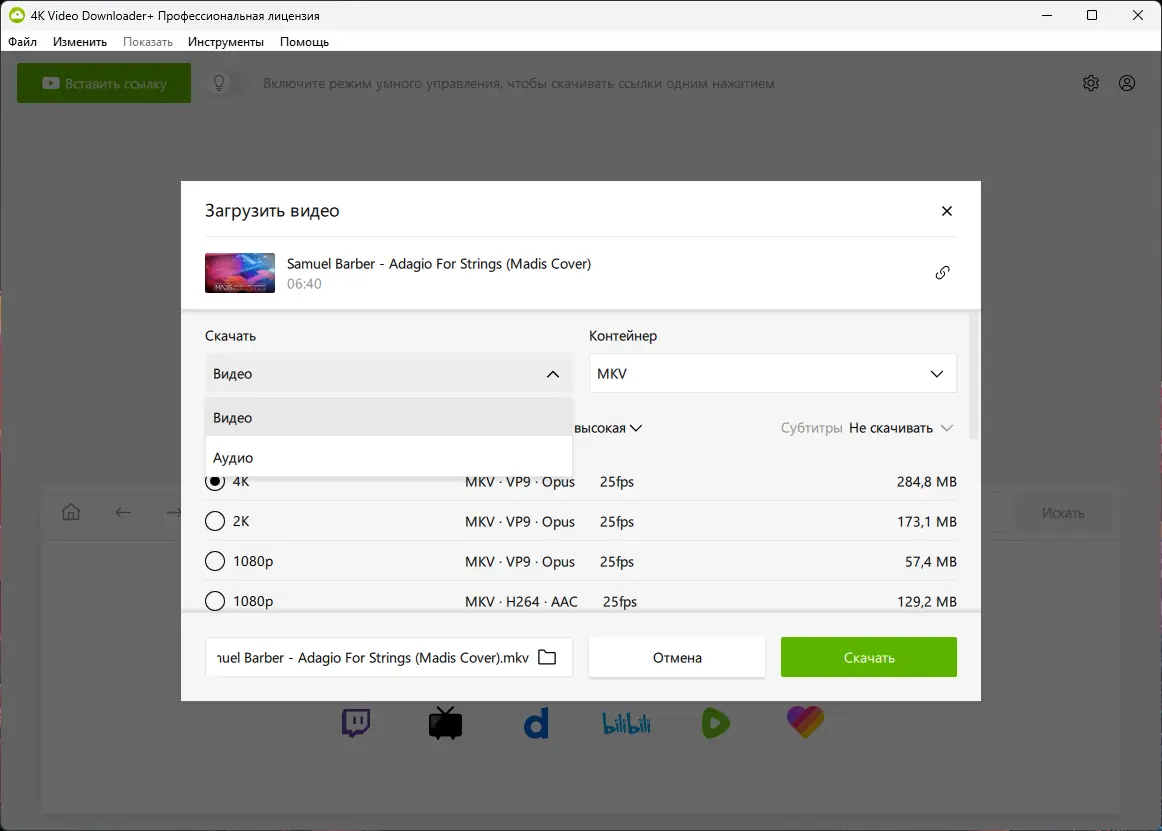 4K Video Downloader — программа для загрузки видео, аудио и субтитров с YouTube и других популярных платформ. Она поддерживает высокие разрешения, включая 4К и 8К, а также позволяет сохранять контент в различных форматах для просмотра на разных устройствах.