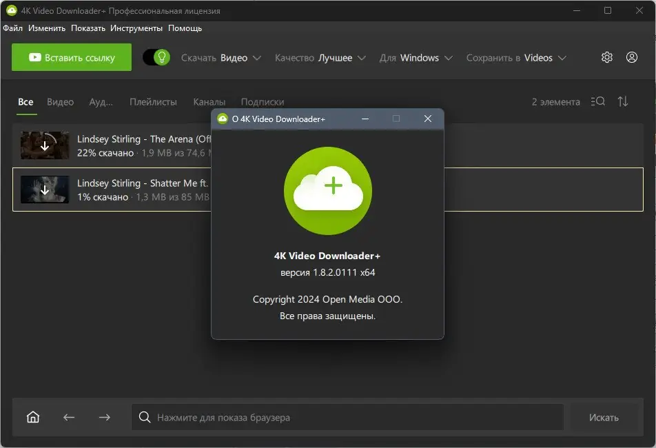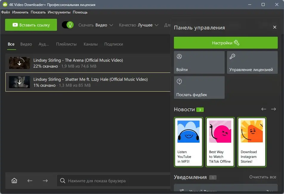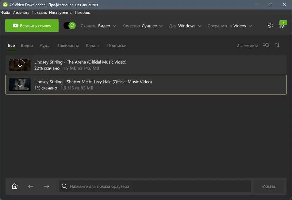 4K Video Downloader — программа для загрузки видео, аудио и субтитров с YouTube и других популярных платформ. Поддерживает высокие разрешения, включая 4K и 8K, а также позволяет скачивать целые плейлисты и каналы с автоматической синхронизацией. Утилита работает на Windows, macOS и Linux, обладает интуитивным интерфейсом и поддерживает множество форматов вывода. С её помощью можно легко сохранять контент для оффлайн-просмотра, в том числе 360° и 3D-видео, а также импортировать ссылки пачками.
