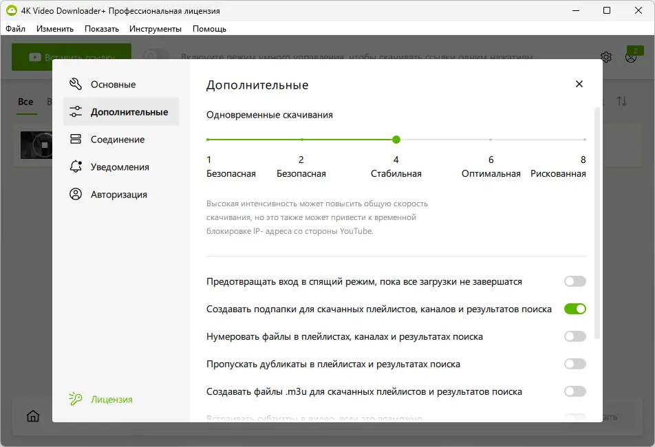 - Настраиваемые параметры загрузки: потоки, прокси, скорость