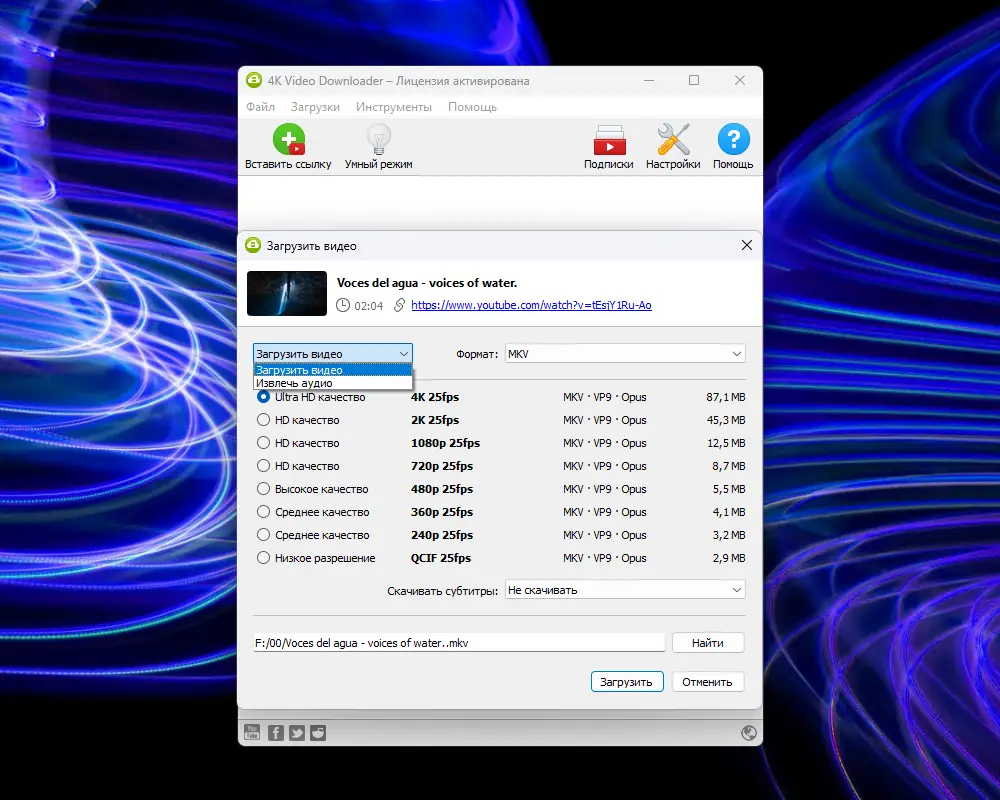4K Video Downloader — это удобное приложение для загрузки видео, аудио и субтитров с популярных платформ, включая YouTube, Vimeo и другие. Программа поддерживает высокие разрешения, включая 4K и 8K, а также позволяет сохранять контент в различных форматах для просмотра на разных устройствах.