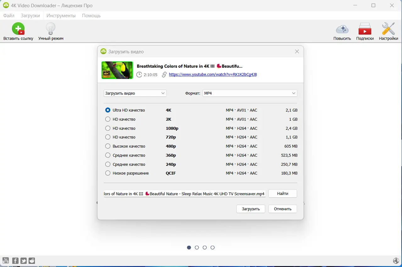 4K Video Downloader — это инструмент для скачивания мультимедиа с популярных онлайн-сервисов, в первую очередь ориентированный на YouTube. Программа позволяет получать доступ к видео в высоком качестве, включая форматы 4K и 8K, а также извлекать аудиодорожки в MP3 и других аудиоформатах. Поддержка субтитров, 3D и 360° видео делает её универсальным решением для пользователей, которым важен полный контроль над контентом.