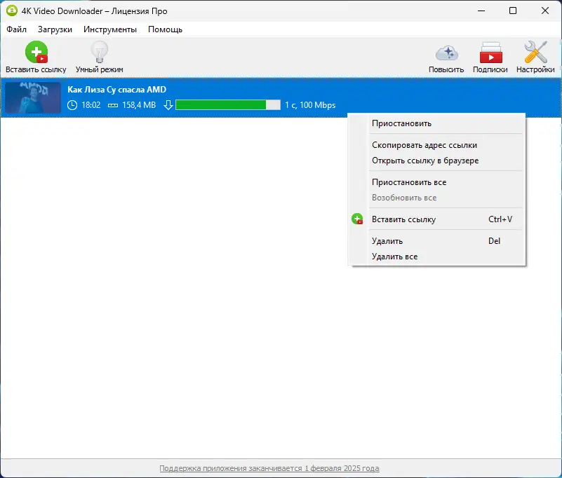 - Гибкие настройки загрузки: выбор формата, качества, папки и скорости.