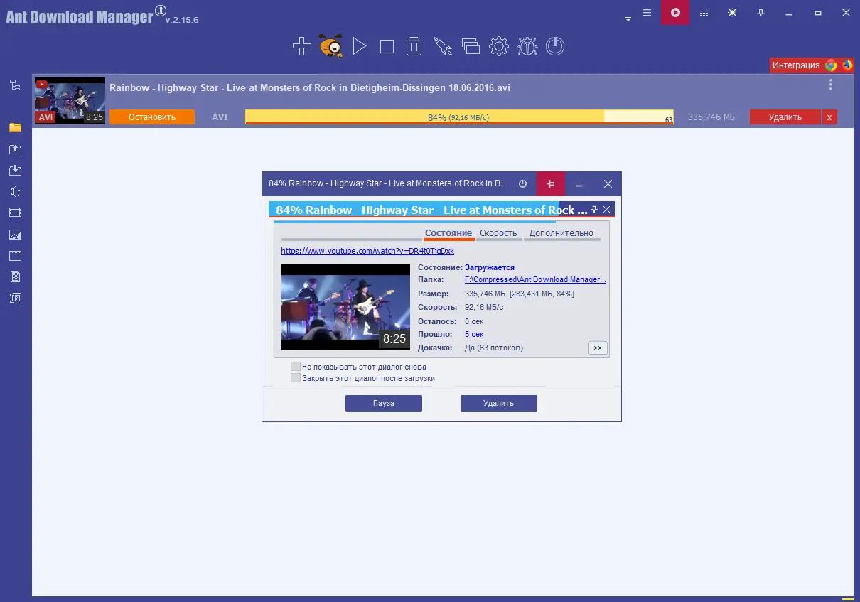 Ant Download Manager — это мощный менеджер загрузок, способный значительно ускорить скачивание файлов за счёт многопоточной загрузки, поддержки возобновления и автоматического захвата медиа с популярных сайтов. Программа совместима с основными браузерами, поддерживает протоколы HTTP(S), FTP(S), BitTorrent, а также потоковые форматы, включая HLS и MPEG-DASH. Она позволяет эффективно управлять закачками, распознавать видео с YouTube и других платформ, извлекать аудиодорожки и конвертировать их в MP3. Интерфейс интуитивно понятен, а функции автоматизации и планирования делают процесс загрузки максимально комфортным. Подходит как для повседневного использования, так и для сложных задач, связанных с обработкой большого объёма данных.