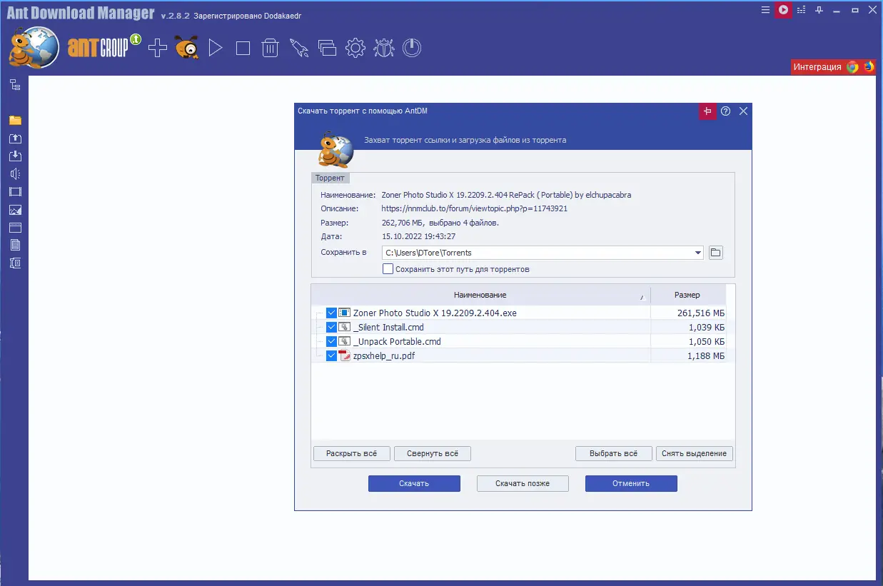 Доступна версия 2.15 с возможностью установки через repack от Dodakaedr, включающий русский, английский и украинский языки. Пользователи могут выбрать между установочной и портативной сборкой, а также настроить процесс через командные ключи. Программа позволяет, в том числе, как скачать с кинопоискакинопоиск> видео, если ресурс предоставляет прямые ссылки. Хотя Ant Download Manager не предназначен для работы с торрент, он эффективен для прямых загрузок. Также доступна версия pro скачать без дополнительных ограничений. Официальный релиз и repack обеспечивают стабильную работу на различных системах.
