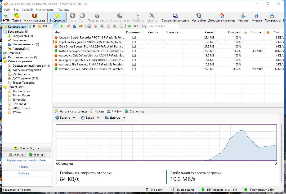 BitComet — это надежный торрент-клиент, обеспечивающий высокую скорость загрузки файлов по протоколу BitTorrent. Программа поддерживает современные технологии, включая работу с magnet-ссылками, DHT-сетями и прокси-серверами. Благодаря интуитивному интерфейсу и широкому набору функций, она подходит как для новичков, так и для опытных пользователей, активно использующих пиринговые сети.