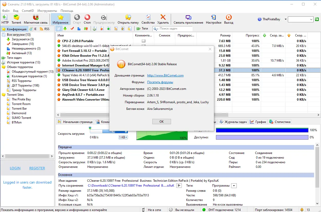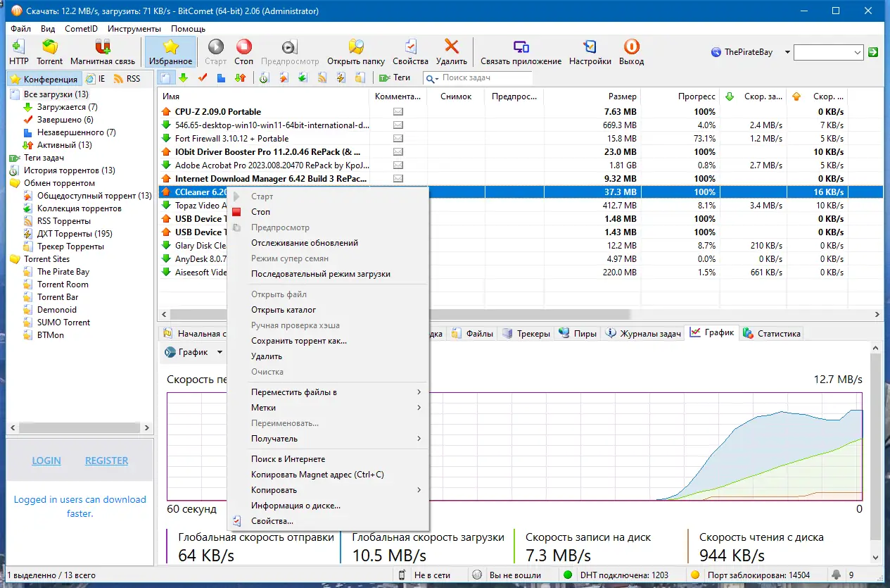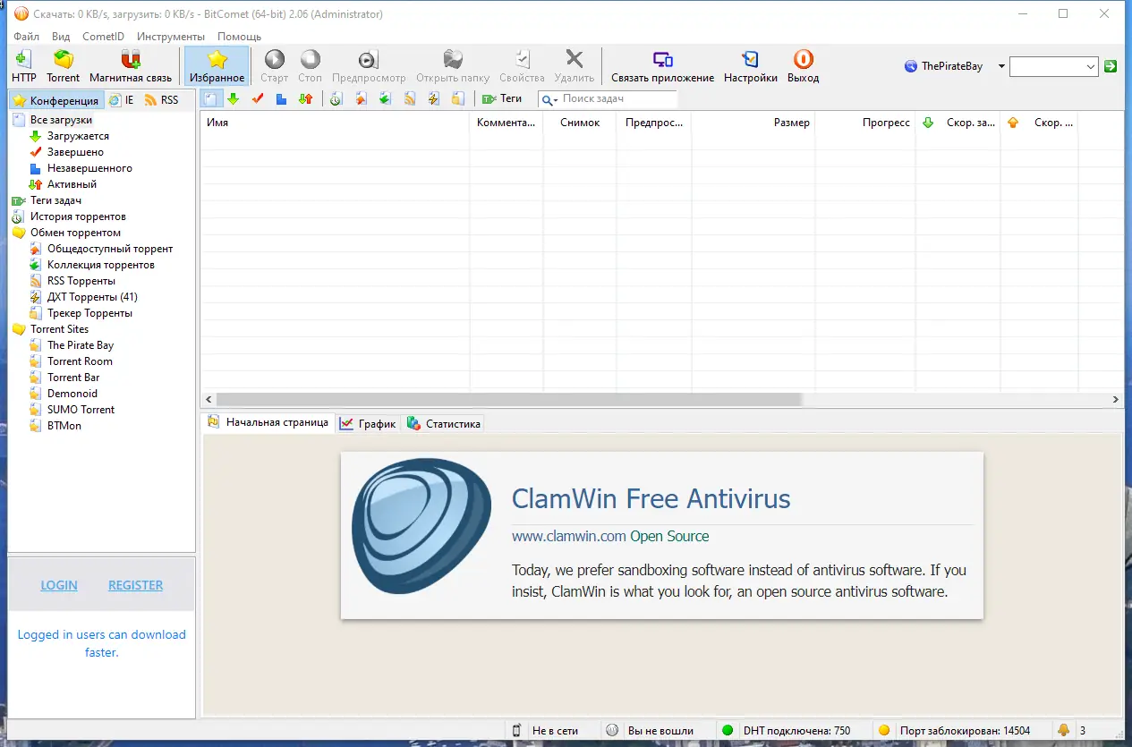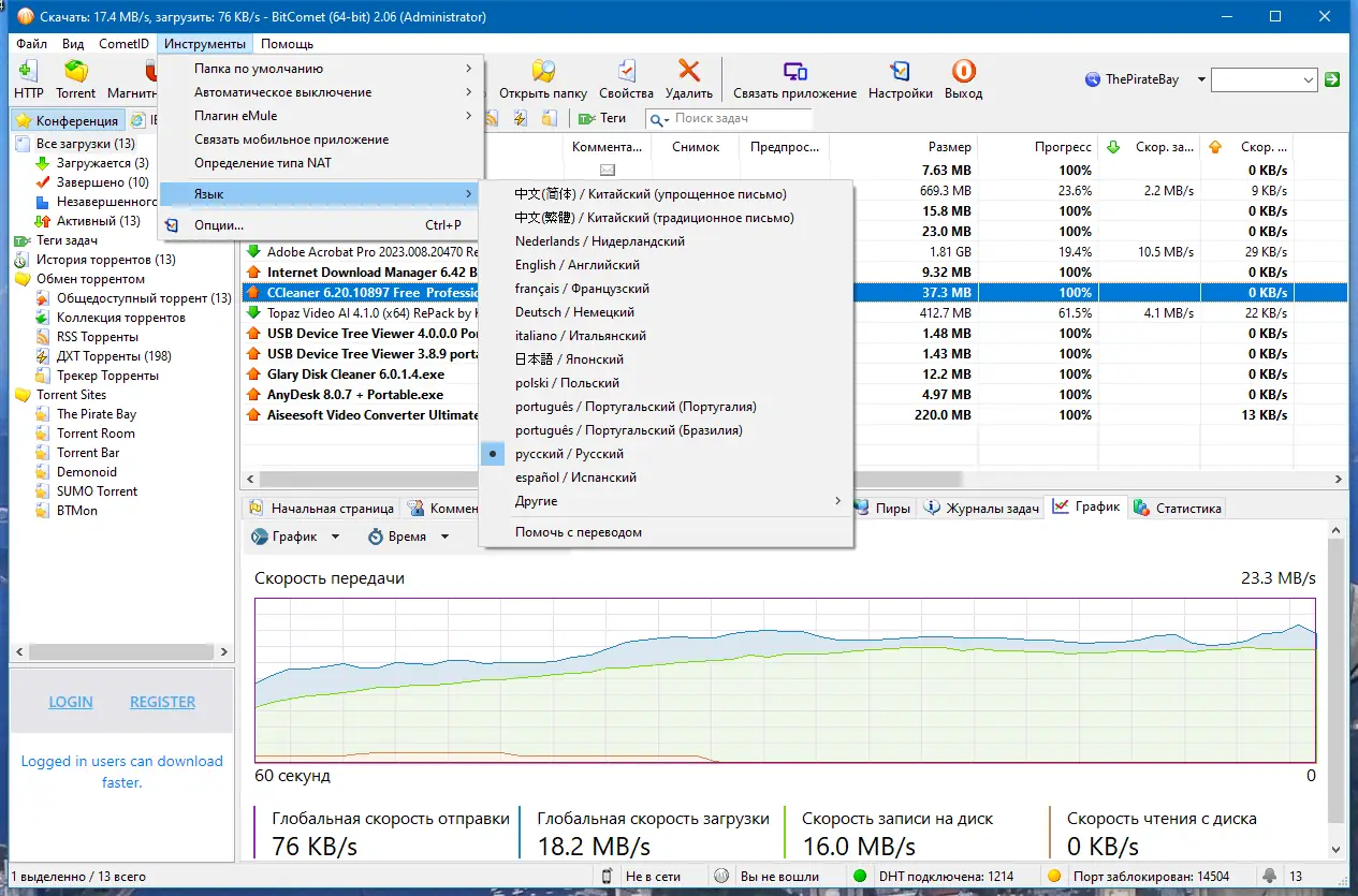 BitComet — это надежный торрент-клиент с продвинутыми функциями управления загрузками, поддерживающий Bittorrent, DHT, Magnet-ссылки и оптимизированный для стабильной работы на различных типах соединений, включая ситуации, когда порт заблокирован провайдером. Программа сочетает в себе высокую скорость, гибкие настройки и простоту использования, что делает её популярным выбором среди пользователей, предпочитающих эффективное скачивание файлов через сеть. Благодаря встроенной системе управления кэшем и поддержке приоритетов, BitComet обеспечивает стабильную работу даже при ограниченных ресурсах.