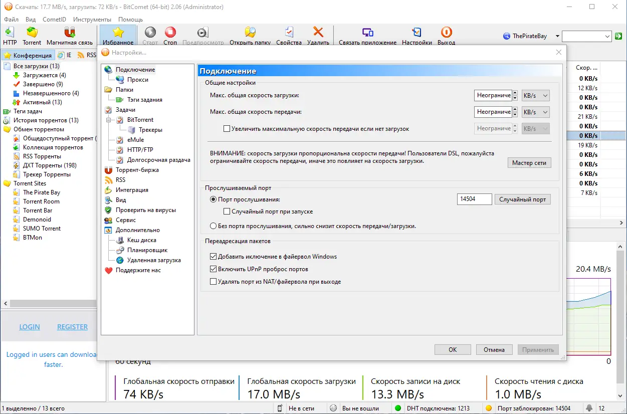 BitComet эффективно работает даже при нестабильном соединении и помогает обойти ограничения, связанные с заблокированным портом.