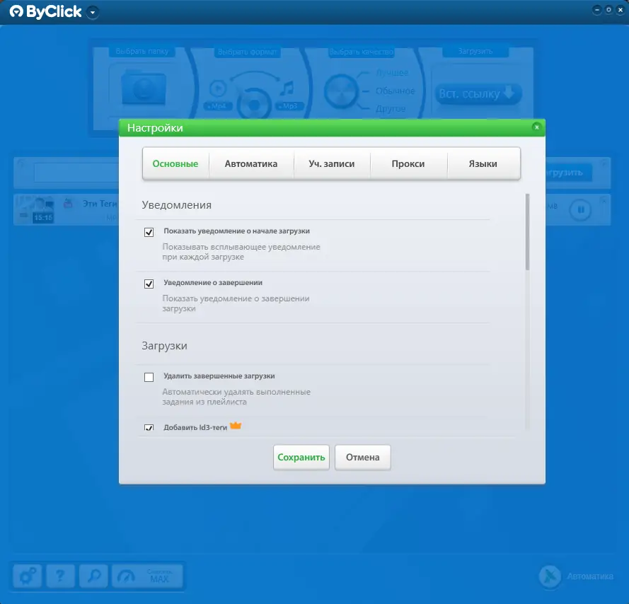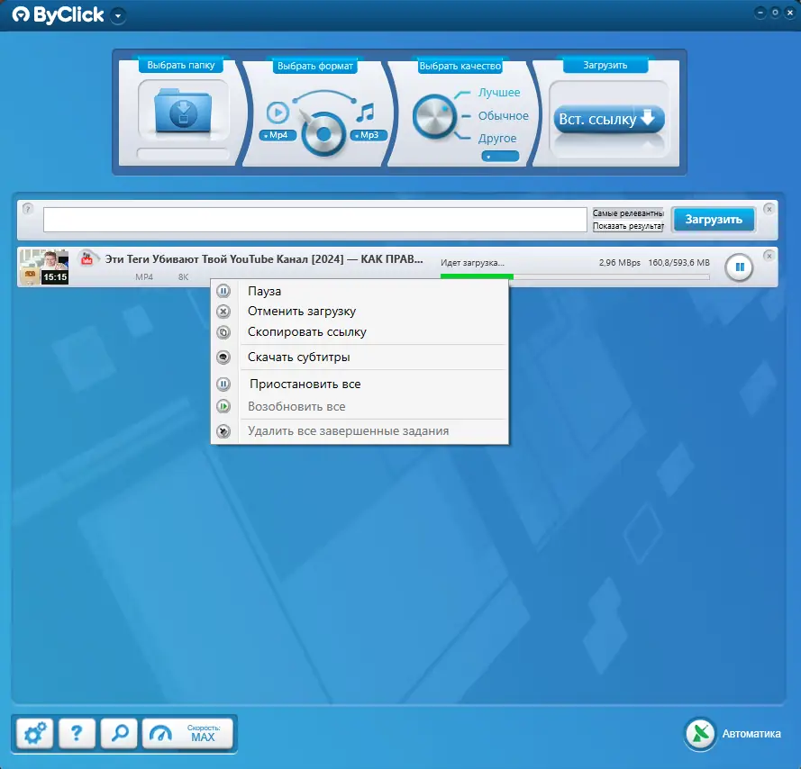 - Поддерживает загрузку целых плейлистов и видео с каналов.