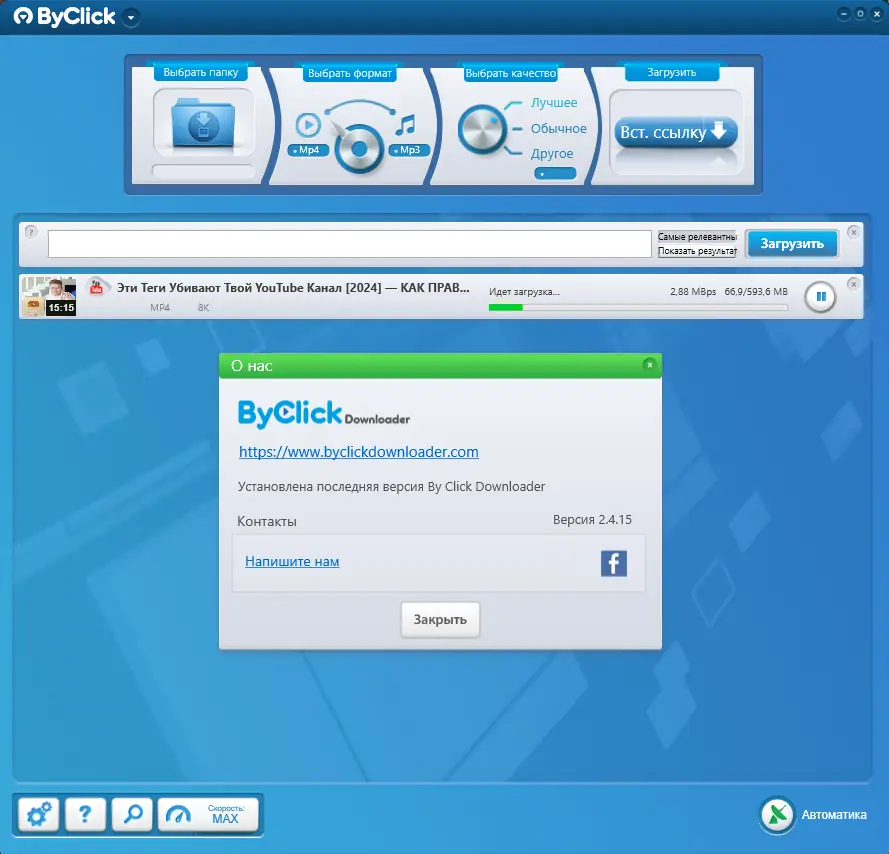 By Click Downloader — удобное приложение для загрузки видео и аудио с YouTube, Facebook, Vimeo, Dailymotion и других популярных платформ. Поддерживает скачивание в высоком качестве, конвертацию в различные форматы и работу с плейлистами и каналами.