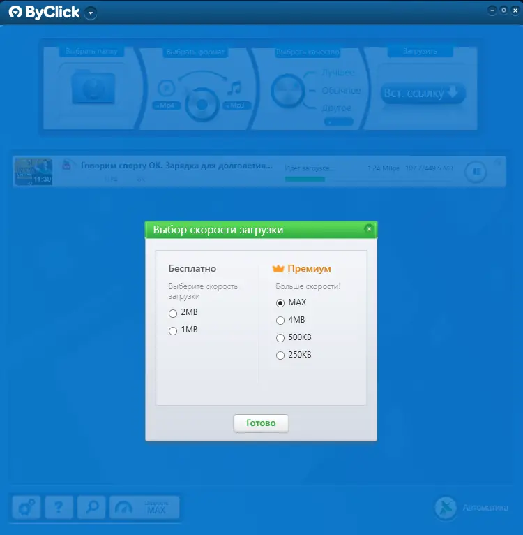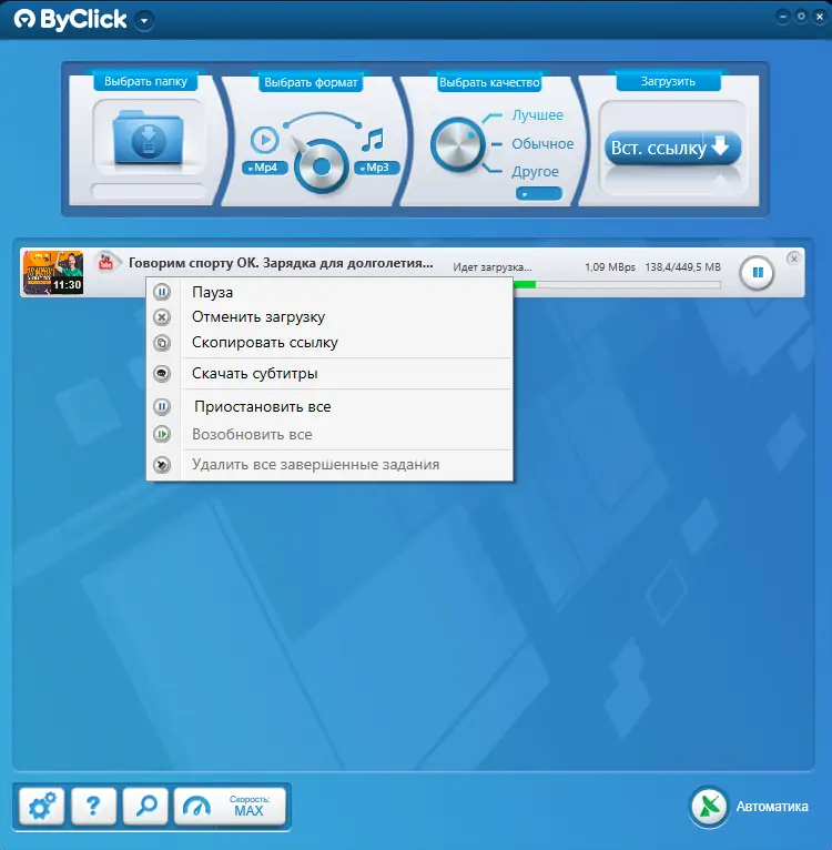 Преимущества By Click Downloader очевидны: высокая скорость загрузки, поддержка множества форматов и сайтов, удобный интерфейс. Программа стабильно работает с длинными видео и плейлистами, не зависая при длительных сессиях. При этом она не перегружает систему и оптимизирована для слабых компьютеров. Утилита также предлагает расширенные настройки для пользователей, предпочитающих ручное управление процессом.