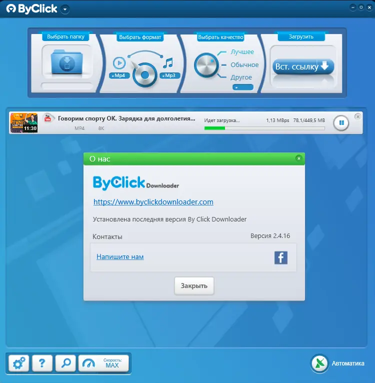 By Click Downloader — это универсальное приложение для быстрого и удобного извлечения видео и аудио из YouTube, Facebook, Vimeo, OK.ru, RuTube и других популярных платформ. Программа поддерживает скачивание отдельных роликов, плейлистов, каналов и конвертацию в различные форматы, включая MP3, MP4, AVI и другие. Утилита совместима с основными браузерами и предлагает как классическую загрузку через URL, так и автоматическое распознавание контента прямо в браузере.