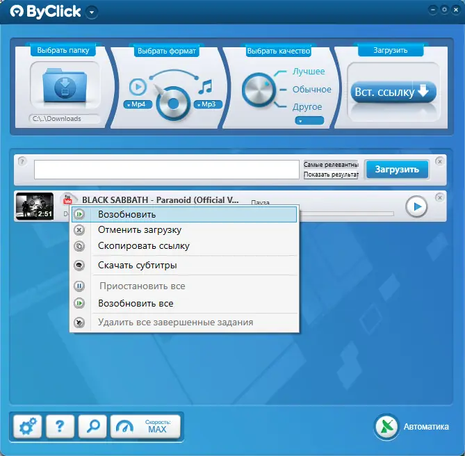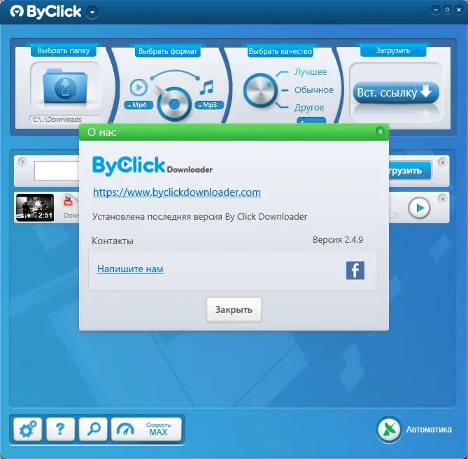 By Click Downloader — это многофункциональный инструмент для загрузки видео и аудио с YouTube, Facebook, Vimeo, RuTube, OK.ru и других популярных платформ. Программа поддерживает высокие разрешения, включая 1080p и 4K, а также конвертацию в различные форматы, включая MP3, MP4, AVI и другие. Утилита интегрируется с браузерами, автоматически распознаёт видео на странице и позволяет начать загрузку в пару кликов. Подходит как для разовой, так и для массовой выгрузки контента.