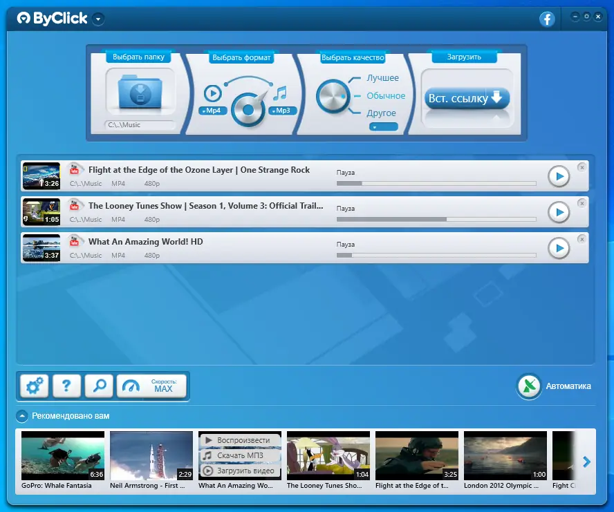 - Высокоскоростная загрузка с автоматическим выбором лучшего качества
