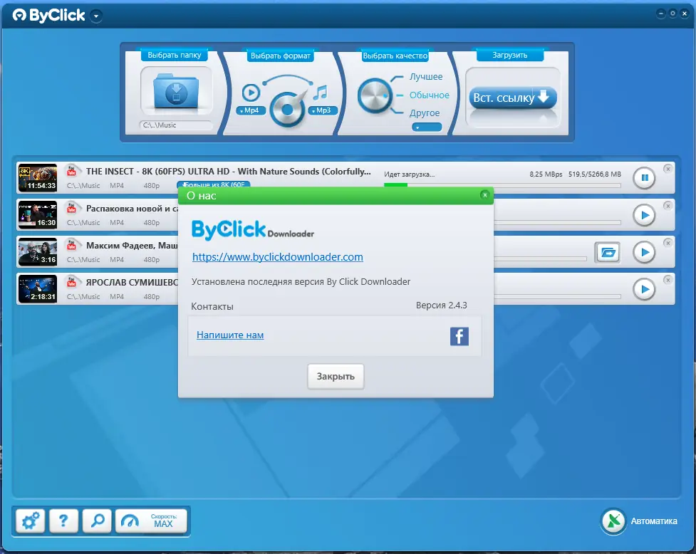 ByClick Downloader — программа для быстрого и удобного скачивания видео с YouTube, Facebook, Vimeo, RuTube, OK.ru и других популярных платформ. Поддерживает загрузку отдельных роликов, плейлистов и каналов в различных форматах и качестве, включая 4K, а также конвертацию в аудио, в том числе MP3, AAC и WAV. Утилита совместима с основными браузерами и предлагает портативную версию для запуска без установки.