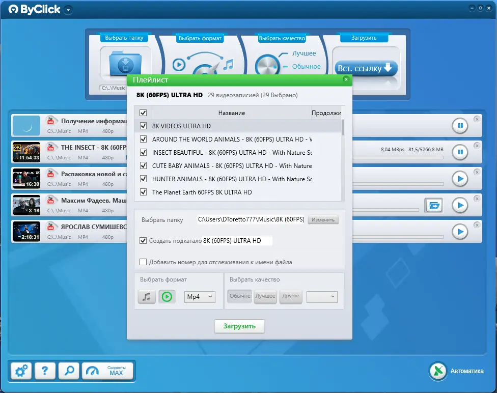 - Загрузка в высоком качестве — вплоть до 4K, с выбором разрешения 720p, 1080p или выше.
