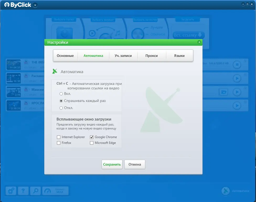 - Интеграция с браузерами Chrome, Firefox, Internet Explorer и Edge для мгновенного захвата видео.