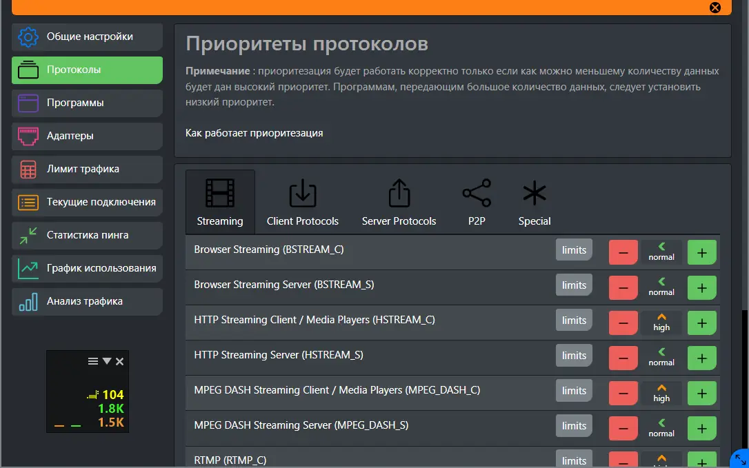- Автоматическая настройка параметров пропускной способности в зависимости от текущего соединения.