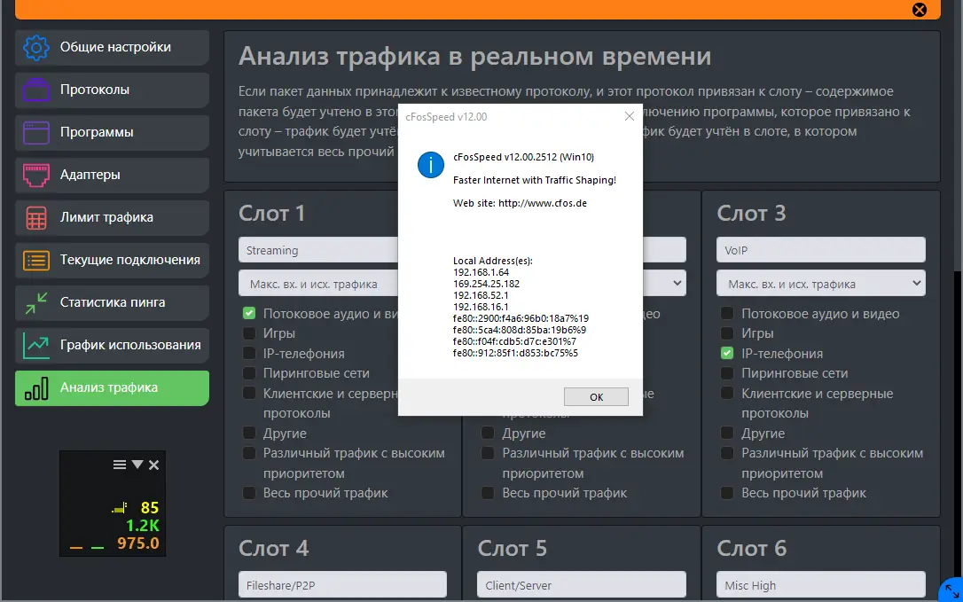 После установки cFosSpeed запускается автоматически и начинает анализировать сетевую активность. Пользователю доступно окно статуса, где отображаются текущие соединения, их приоритет и объём передаваемых данных. Через настройки можно вручную задать приоритет для определённых приложений, например, повысить приоритет браузера или игрового клиента. Программа также позволяет настраивать правила по протоколу, порту или IP-адресу, обеспечивая гибкое управление трафиком. Дополнительно доступна калибровка пропускной способности для максимально точной оптимизации.