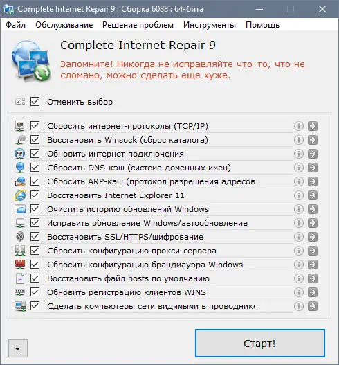 - Обновление интернет-подключений с перезапуском сетевых адаптеров и обновлением параметров DHCP, аналогично выполнению команды ipconfig /renew.