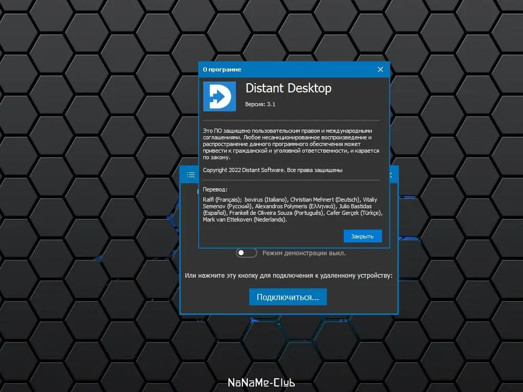 Distant Desktop — это программное обеспечение для удалённого доступа к компьютерам, позволяющее управлять системой из любой точки мира. Вы получаете полный контроль над удалённым устройством: работайте с приложениями, файлами, окнами и периферийными устройствами, как будто сидите за ним лично. Программа поддерживает передачу файлов, текстовый чат, голосовую связь и демонстрационный режим, обеспечивая удобное взаимодействие между пользователями.