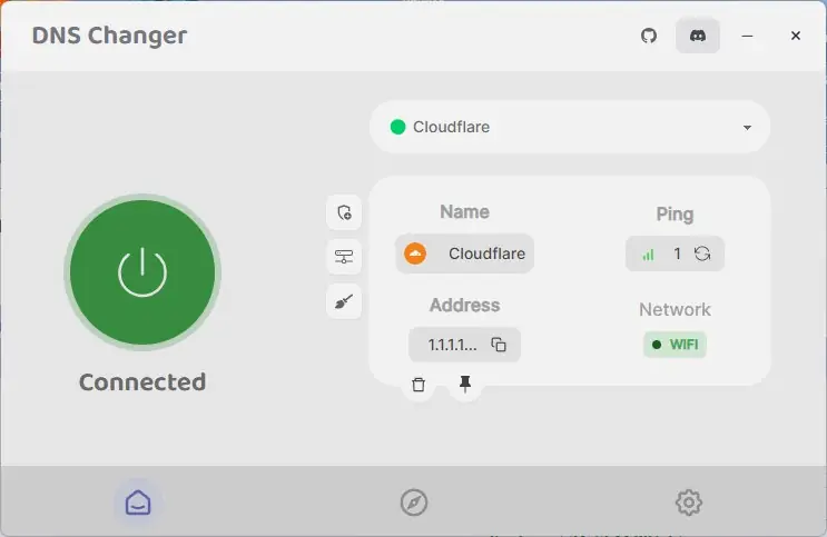 DNS Changer — это компактное приложение для быстрой и удобной смены DNS-серверов в системе. Программа позволяет мгновенно переключаться между различными публичными серверами, включая решения от Cloudflare, Asiatech и других провайдеров, обеспечивая стабильное соединение и оптимальную скорость отклика. Интерфейс интуитивно понятен, а процесс подключения отображается в реальном времени с указанием ping и текущего статуса.
