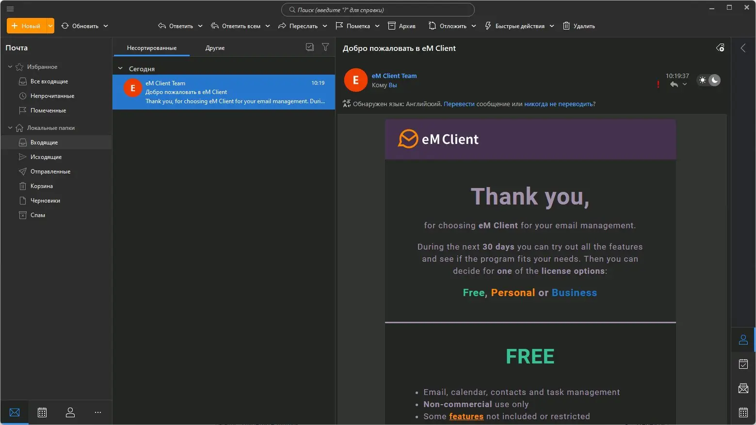 eM Client сочетает в себе надежность, производительность и интуитивно понятный дизайн. Программа позволяет не только отправлять и получать электронные письма, но и эффективно управлять расписанием, задачами и контактами в единой среде. Поддержка таких протоколов, как IMAP, POP3, SMTP, CalDAV и AirSync, делает возможным подключение к большинству популярных почтовых сервисов без дополнительной настройки.