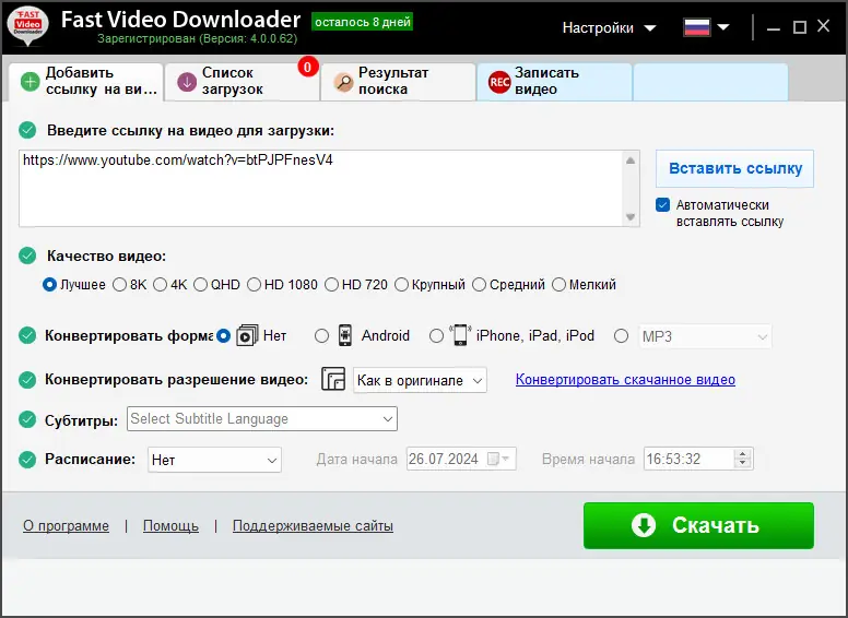 Использование приложения не вызывает затруднений даже у новичков. Достаточно скопировать ссылку на нужный ролик из браузера и вставить её в указанное поле. В большинстве случаев адрес появляется автоматически после копирования. После этого остаётся выбрать формат и качество, после чего нажать кнопку «Скачать». Процесс загрузки начинается мгновенно, а прогресс отображается в понятном виде. При необходимости можно ставить загрузку на паузу или отменять её. Также реализована функция поиска видео прямо из интерфейса программы — достаточно ввести ключевое слово, и система выдаст соответствующие результаты. Это экономит время и упрощает доступ к нужному контенту.