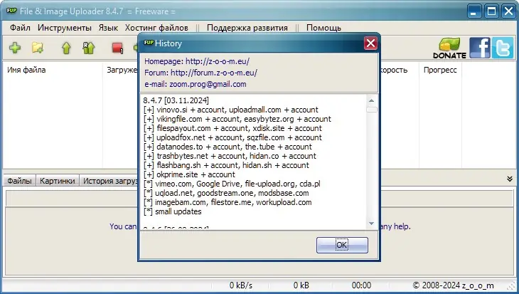 File & Image Uploader доступна для бесплатного скачивания и использования. Бесплатная версия предоставляет доступ ко всем основным функциям, включая загрузку на платные аккаунты и использование прокси. Для пользователей, желающих поддержать разработчика, предусмотрена возможность пожертвования с получением зарегистрированной версии. Программа регулярно обновляется, добавляя поддержку новых хостингов и улучшая совместимость с существующими.