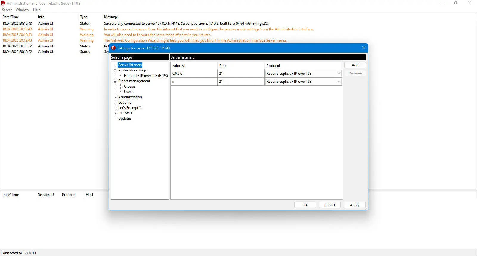 После установки FileZilla Server запускается как служба, а доступ к настройкам осуществляется через отдельное приложение-интерфейс. Первым шагом является подключение к локальному серверу, после чего можно начать настройку пользователей и директорий. Для каждого пользователя задаётся логин, пароль, корневая папка и права на чтение, запись, переименование или удаление файлов. Также доступна настройка IP-фильтров, ограничений по количеству соединений и шифрования передачи. Для внешнего доступа требуется корректная настройка маршрутизатора и проброс портов.