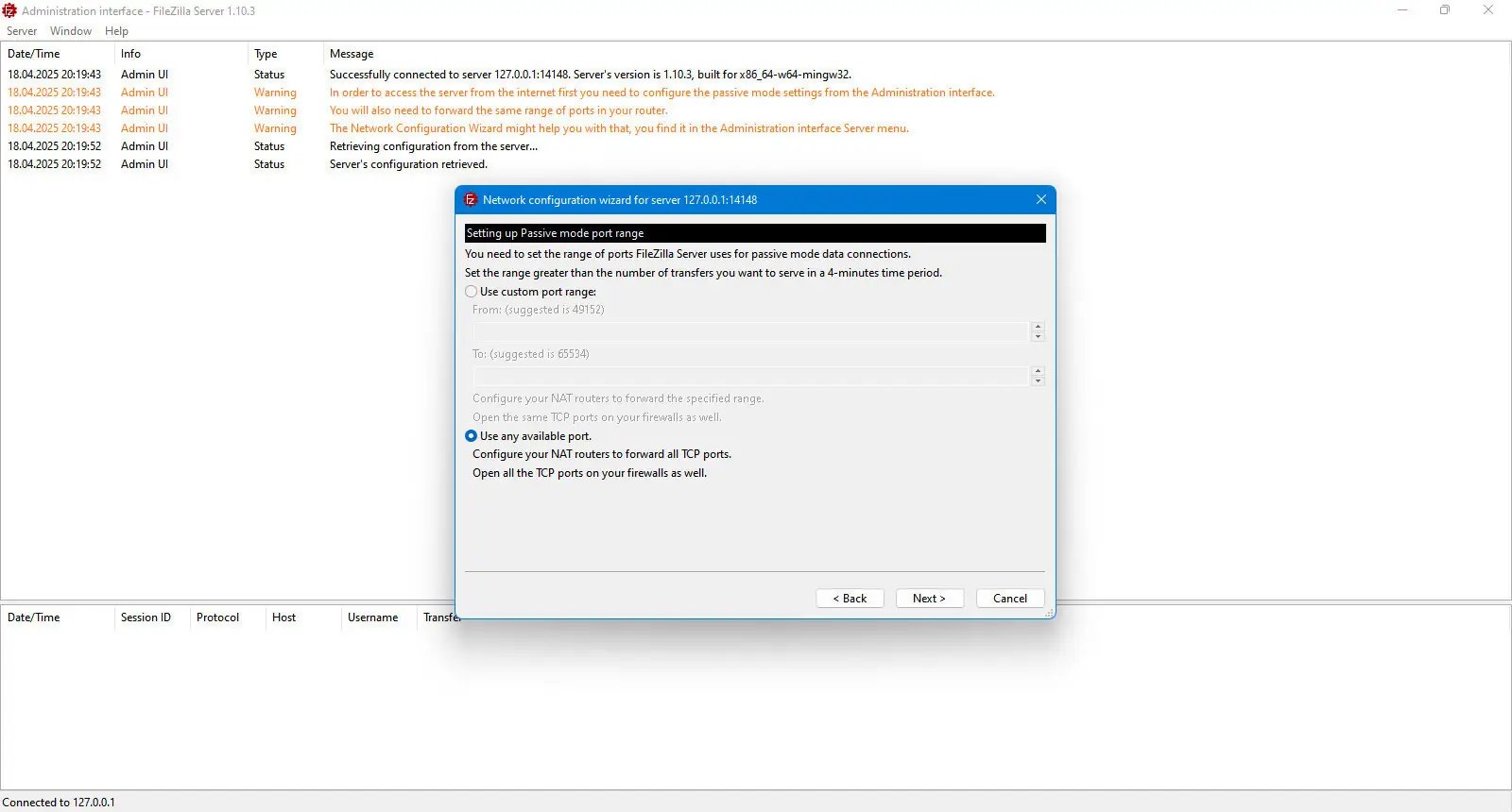 - FileZilla Server может быть настроен для работы через NAT и брандмауэры с минимальными изменениями.