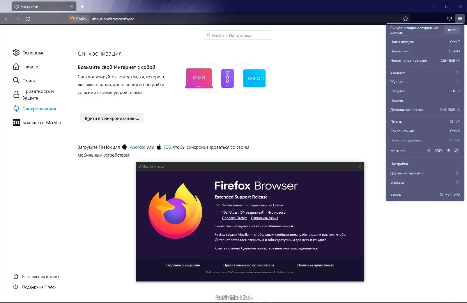 - Функция синхронизации данных между устройствами доступна после авторизации в учётной записи mozilla.