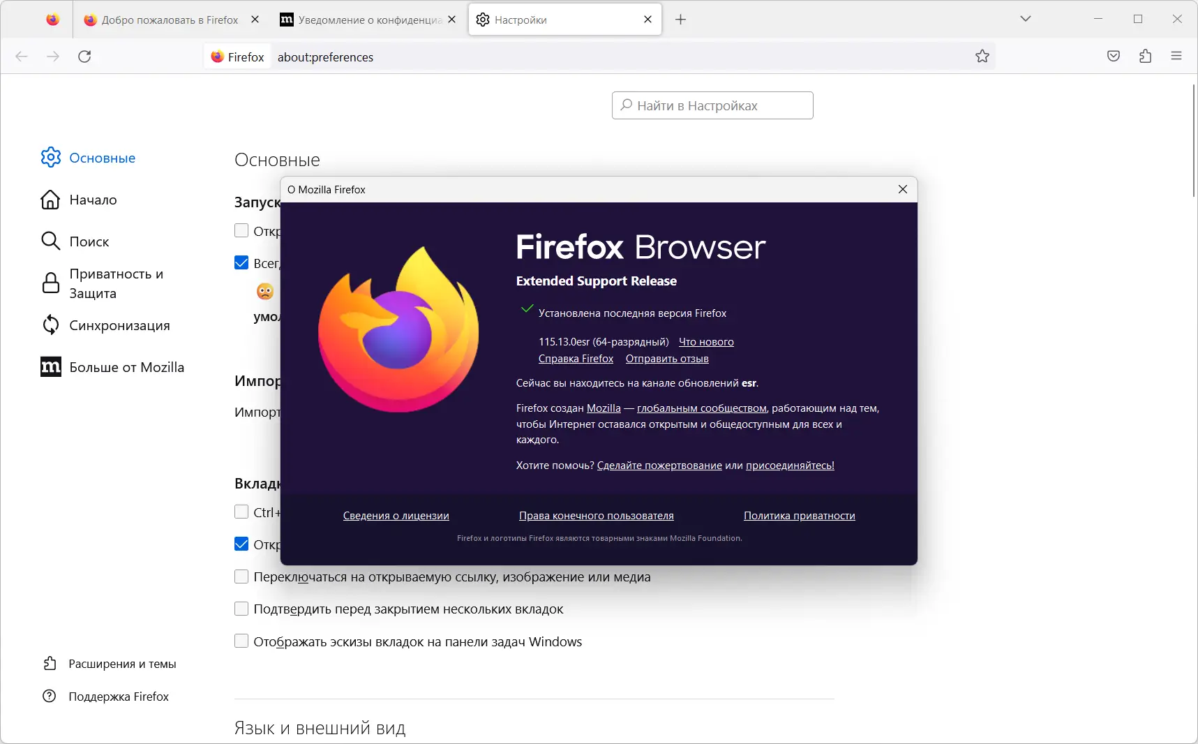 Mozilla Firefox — это полнофункциональный веб-браузер, созданный для эффективного и безопасного просмотра интернета. Он разрабатывается некоммерческой организацией Mozilla Foundation, что подчёркивает её приверженность свободе в сети и защите пользовательских данных. Программа доступна для множества платформ, включая Windows, Linux и macOS, и предлагает как стандартные, так и расширенные функции для разных категорий пользователей. Версия esr предназначена для организаций, которым требуется стабильность и длительная поддержка без частых изменений в интерфейсе и функционале.
