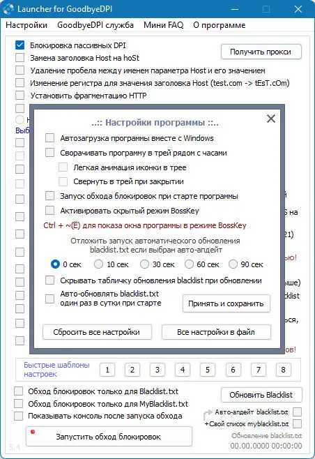 Использование утилиты начинается с запуска лаунчера от имени администратора, после чего доступны быстрые шаблоны настройки. Рекомендуется сначала протестировать стандартные режимы, прежде чем переходить к ручной конфигурации. В случае, если сайты перестали открываться, следует отключать параметры по одному, чтобы выявить конфликтующий. Для пользователей, предпочитающих автоматизацию, реализована функция ежедневного обновления черного списка с возможностью настройки тайм-аута. Также поддерживается ручное обновление без ограничений. При необходимости можно сбросить все параметры через команду с флагом /reset или через меню настроек. Интеграция с системой позволяет использовать GoodbyeDPI как службу, что исключает необходимость держать окно программы открытым.