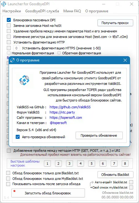 GoodbyeDPI — утилита, разработанная программистом ValdikSS, предназначенная для противодействия технологиям DPI, применяемым провайдерами для ограничения доступа к сайтам. Программа эффективно обходит блокировки на уровне IP-адресов и работает как с пассивными, так и с активными системами анализа трафика. Для удобства пользователей создан отдельный лаунчер с графическим интерфейсом, упрощающий настройку и запуск основного инструмента. При этом сама утилита функционирует полностью автономно, без подключения к внешним серверам, что гарантирует конфиденциальность и высокую производительность.