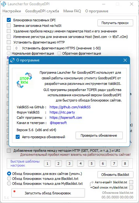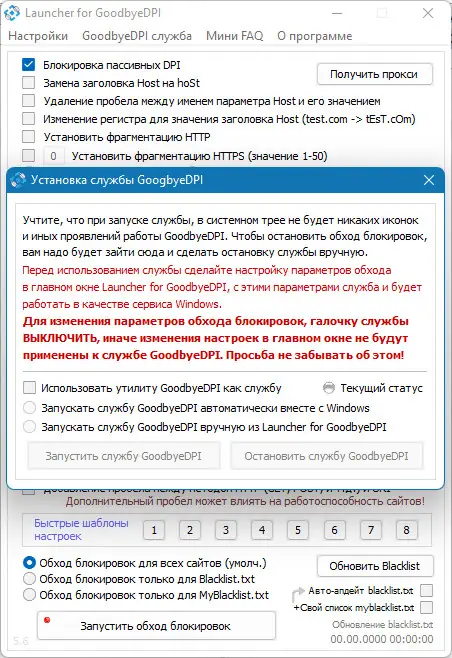 Для запуска программы необходимо выбрать версию, соответствующую разрядности операционной системы — x86 или x64 — и запустить лаунчер от имени администратора. После запуска доступны быстрые настройки, позволяющие включить оптимальные параметры для большинства случаев. При необходимости можно перейти к ручной настройке, активируя нужные методы обхода. Программа поддерживает автоматическое обновление чёрного списка раз в сутки, а также ручное обновление при необходимости. Для пользователей, желающих использовать собственные правила, предусмотрен файл myblacklist.txt, строки из которого добавляются в основной список после каждого обновления. Это позволяет сохранять индивидуальные настройки при синхронизации с внешними источниками. В случае возникновения проблем, таких как если сайт перестал открываться, рекомендуется отключать параметры по одному до восстановления работоспособности или выполнить общий сброс настроек через меню.