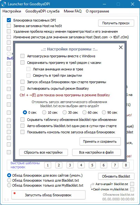 Для запуска необходимо выбрать версию под разрядность системы — x86 или x64 — и запустить GoodbyeDPILauncher от имени администратора. После запуска можно воспользоваться предустановленными шаблонами, которые подбирают оптимальные параметры автоматически. Если стандартные настройки не срабатывают, доступна ручная конфигурация, включающая управление фейковыми запросами, фрагментацией пакетов и другими техниками обхода. При возникновении проблем, например если перестал открываться любой сайт, следует отключать опции по одной, чтобы выявить конфликтующую. В крайнем случае можно выполнить полный сброс через меню «Настройки» или с параметром /reset.