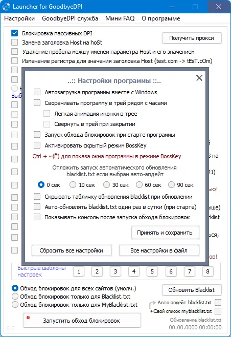 Для начала работы необходимо запустить лаунчер от имени администратора, выбрав версию, соответствующую разрядности системы — x86 или x64. После запуска рекомендуется сначала протестировать предустановленные шаблоны в разделе «Быстрые настройки», поскольку включение всех параметров одновременно может привести к проблемам с доступом в интернет. Если после включения определённых функций какие-либо сайты перестали загружаться, следует отключать галочки по одной, чтобы выявить конфликтующий параметр. При необходимости можно сбросить все настройки через команду /reset. Также доступна ручная настройка, но она требует понимания принципов работы сетевых протоколов. Программа поддерживает автоматическое обновление blacklist.txt один раз в сутки, а также ручное обновление по требованию. Для пользователей, которым нужно добавить собственные домены, реализована поддержка файла myblacklist.txt, строки из которого автоматически дописываются в основной список при обновлении.