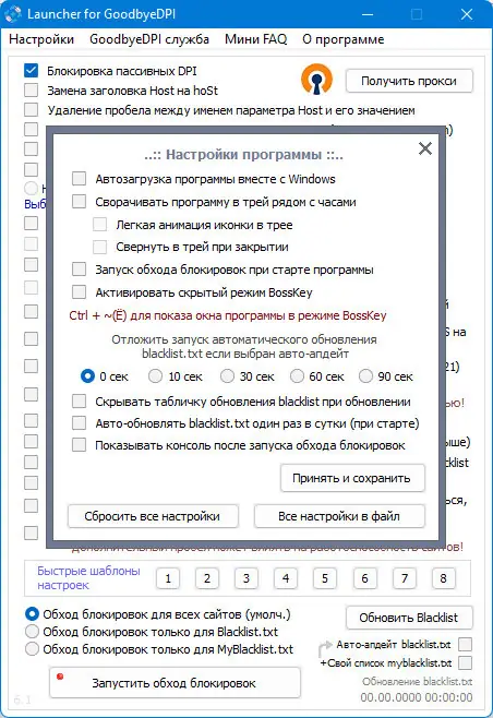 Для корректной работы необходимо запустить GoodbyeDPILauncher от имени администратора, выбрав версию, соответствующую разрядности вашей системы — x86 или x64. После запуска рекомендуется начать с быстрых настроек, протестировав шаблоны под номерами 5, 6 и 7, которые являются актуальными и оптимизированными. Если сайт перестал открываться, следует последовательно отключать параметры до восстановления доступа. В случае сбоев можно выполнить сброс настроек через меню или с параметром /reset. Для постоянной работы рекомендуется настроить запуск как службы Windows, что позволит избежать появления окон и обеспечит стабильную работу в фоне.