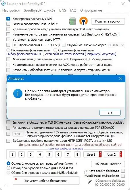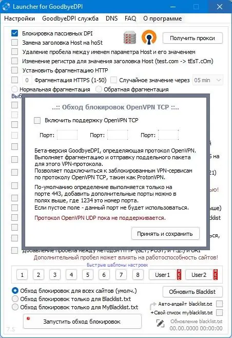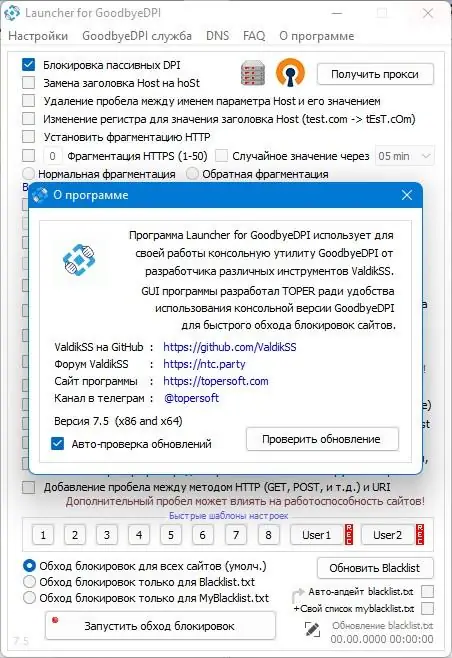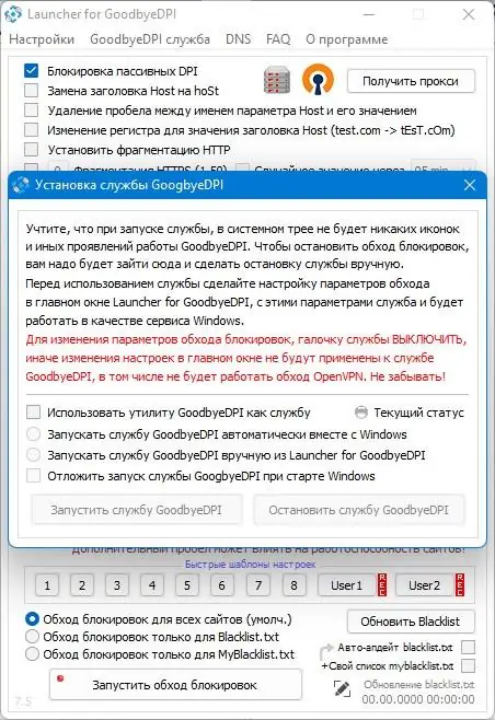 Для запуска программы необходимо выбрать соответствующую разрядность — x86 или x64 — в зависимости от установленной ОС и запустить лаунчер от имени администратора. После запуска рекомендуется начать с быстрых настроек, которые подбирают оптимальные параметры автоматически. При необходимости можно перейти к ручной настройке, активируя нужные методы фрагментации пакетов, изменения TTL или отправки фейковых запросов. Если после включения определённых функций перестал работать доступ к сайтам, следует отключать параметры по одному до восстановления соединения. В случае сбоев доступна функция полного сброса настроек через запуск с параметром /reset. Также реализована возможность использовать собственный список блокировок через файл myblacklist.txt, который интегрируется с основным чёрным списком при его обновлении. Для пользователей OpenVPN добавлена поддержка обхода блокировок в TCP-режиме.