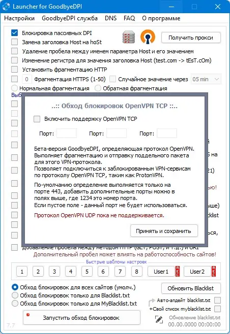 Для начала работы необходимо запустить лаунчер от имени администратора, выбрав версию под соответствующую разрядность системы — x86 или x64. После запуска доступны быстрые настройки, оптимизированные под большинство сценариев использования. При необходимости можно перейти к ручной настройке, активируя нужные методы фрагментации и обхода. Программа поддерживает обновление черного списка с серверов антизапрета, а также позволяет добавлять собственные домены через файл myblacklist.txt, который не затрагивается при обновлении основного списка. Если после обновления или настройки что-то перестал работать, рекомендуется отключать параметры по одному до восстановления доступа или выполнить полный сброс настроек через запуск с ключом /reset.
