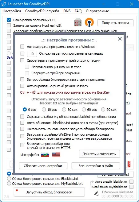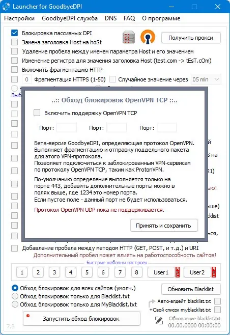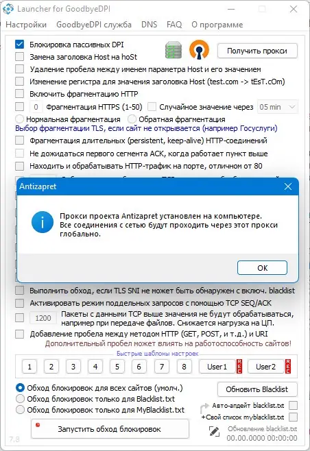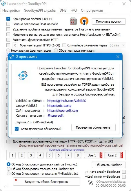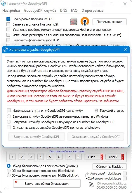 Для начала работы необходимо запустить лаунчер от имени администратора, выбрав версию, соответствующую разрядности операционной системы — x86 или x64. После запуска рекомендуется сначала опробовать быстрые настройки, которые подбирают оптимальные параметры автоматически. При необходимости можно перейти к ручной настройке, активируя нужные методы фрагментации и подмены пакетов. Для добавления пользовательских доменов используется файл myblacklist.txt, строки из которого интегрируются в основной чёрный список при его обновлении. Обновление блеклиста происходит локально, и для этого требуется подключение к интернету только на время загрузки данных. Если возникают проблемы с доступом к сайтам, следует отключать параметры по одному, чтобы выявить конфликтующий режим.