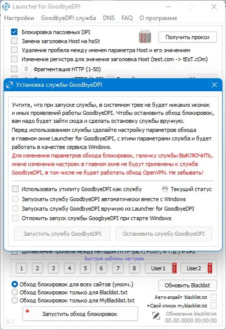 Для начала работы необходимо запустить лаунчер от имени администратора, выбрав подходящую версию для x86 или x64 системы. После запуска доступны быстрые шаблоны настройки, рекомендованные разработчиком, или ручной режим с точной настройкой параметров. Рекомендуется сначала применять шаблоны 2, 3 или 4, особенно при проблемах с доступом к YouTube. При возникновении ошибок, например если сайты перестали открываться, следует отключать параметры по одному, чтобы выявить конфликтующий. Для постоянной работы можно установить GoodbyeDPI как службу — в этом случае программа будет работать в фоне без графического интерфейса.