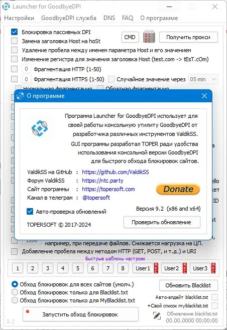 Для начала работы необходимо запустить GoodbyeDPILauncher от имени администратора, выбрав версию x86 или x64 в зависимости от разрядности системы. После запуска доступны быстрые шаблоны настройки, рекомендуемые для типичных сценариев, включая обход блокировок YouTube. При необходимости можно перейти к ручной настройке, активируя нужные методы обхода, такие как фрагментация HTTP, подмена TLS ClientHello или блокировка QUIC. Перед запуском рекомендуется проверить актуальность черного списка, который можно обновить встроенным механизмом. Если после включения программы перестал работать интернет, следует поочерёдно отключать активные методы до восстановления соединения.