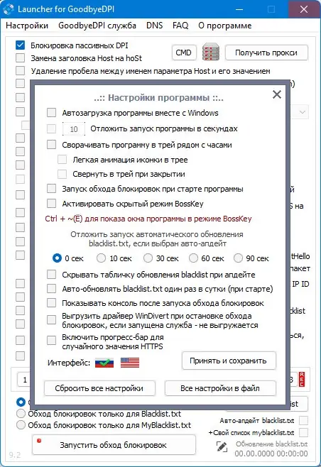 - Поддержка различных режимов обхода DPI